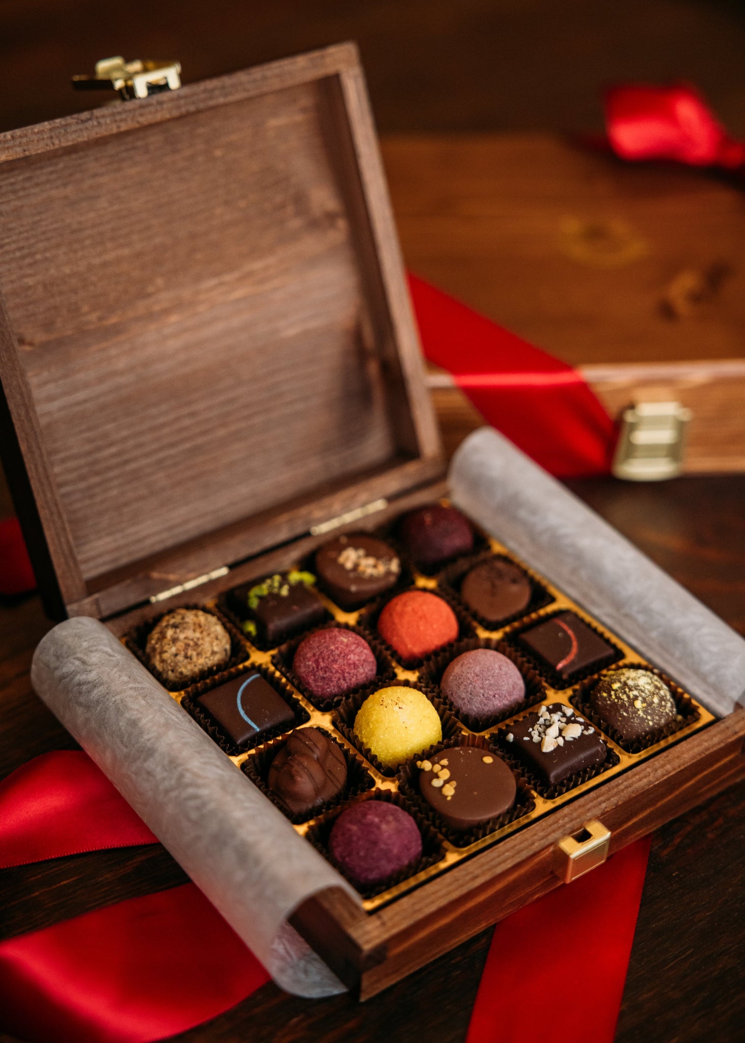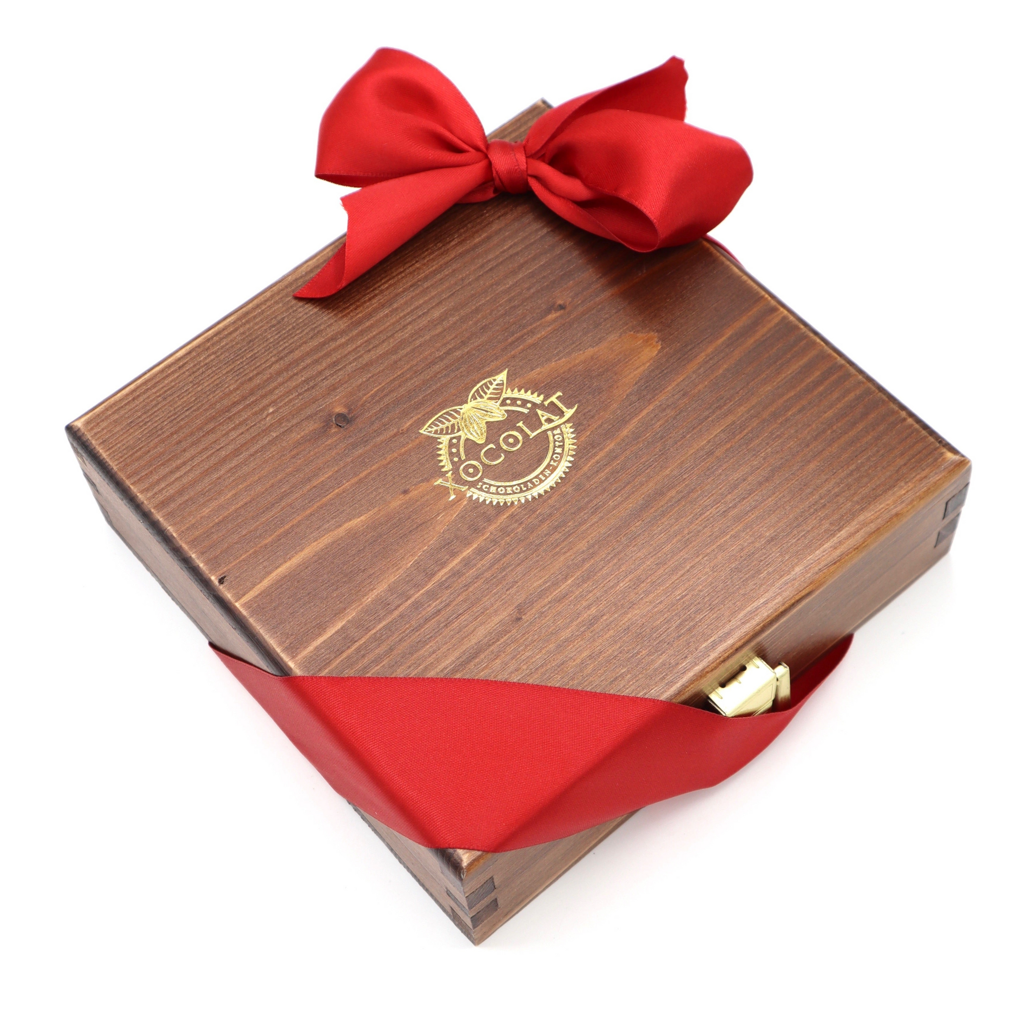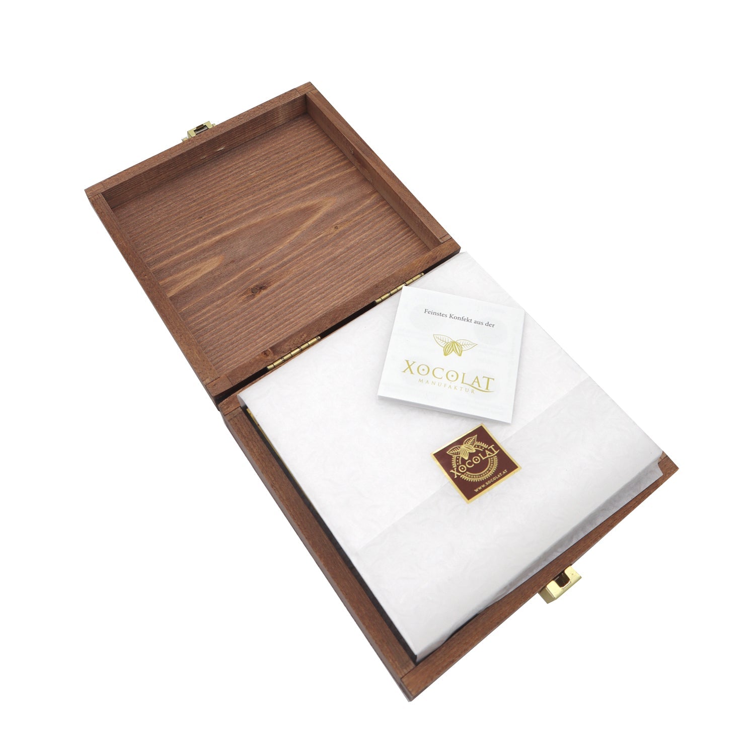 Ein edles Präsent zum besonderen Anlass: Die Xocolat Holz-Bonbonniere mit goldener Prägung. Im Inneren befinden sich 25 Stück optimnal frisches Konfekt aus der Xocolat Manufaktur in Wien.