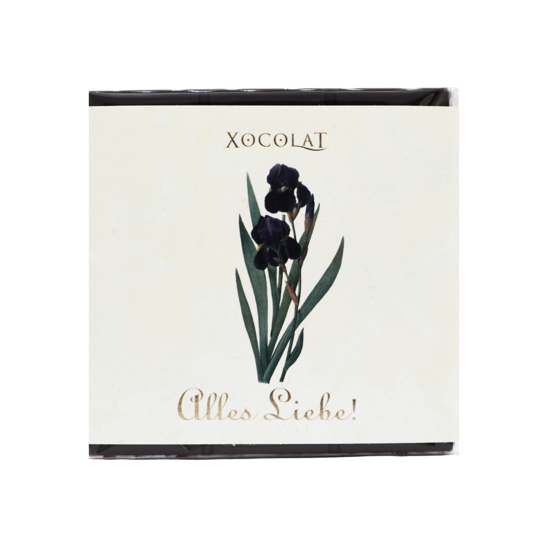 Eine Glückwunschschokolade für anspruchsvolle Genießer, veredelt durch einen eleganten Blumendruck. Handgegossen aus feinster Criollo-Edelbitterschokolade mit 70% Kakaoanteil.