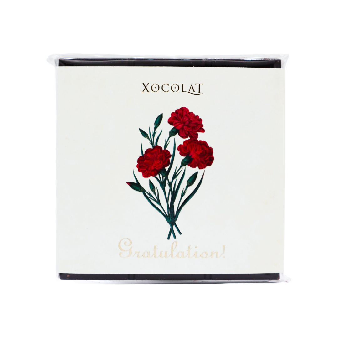 Eine Glückwunschschokolade für anspruchsvolle Genießer, veredelt durch einen eleganten Blumendruck. Handgegossen aus feinster Criollo-Edelbitterschokolade mit 70% Kakaoanteil.