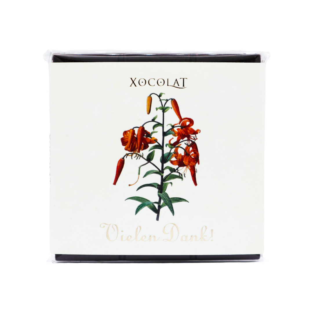 Eine Glückwunschschokolade für anspruchsvolle Genießer, veredelt durch einen eleganten Blumendruck. Handgegossen aus feinster Criollo-Edelbitterschokolade mit 70% Kakaoanteil.