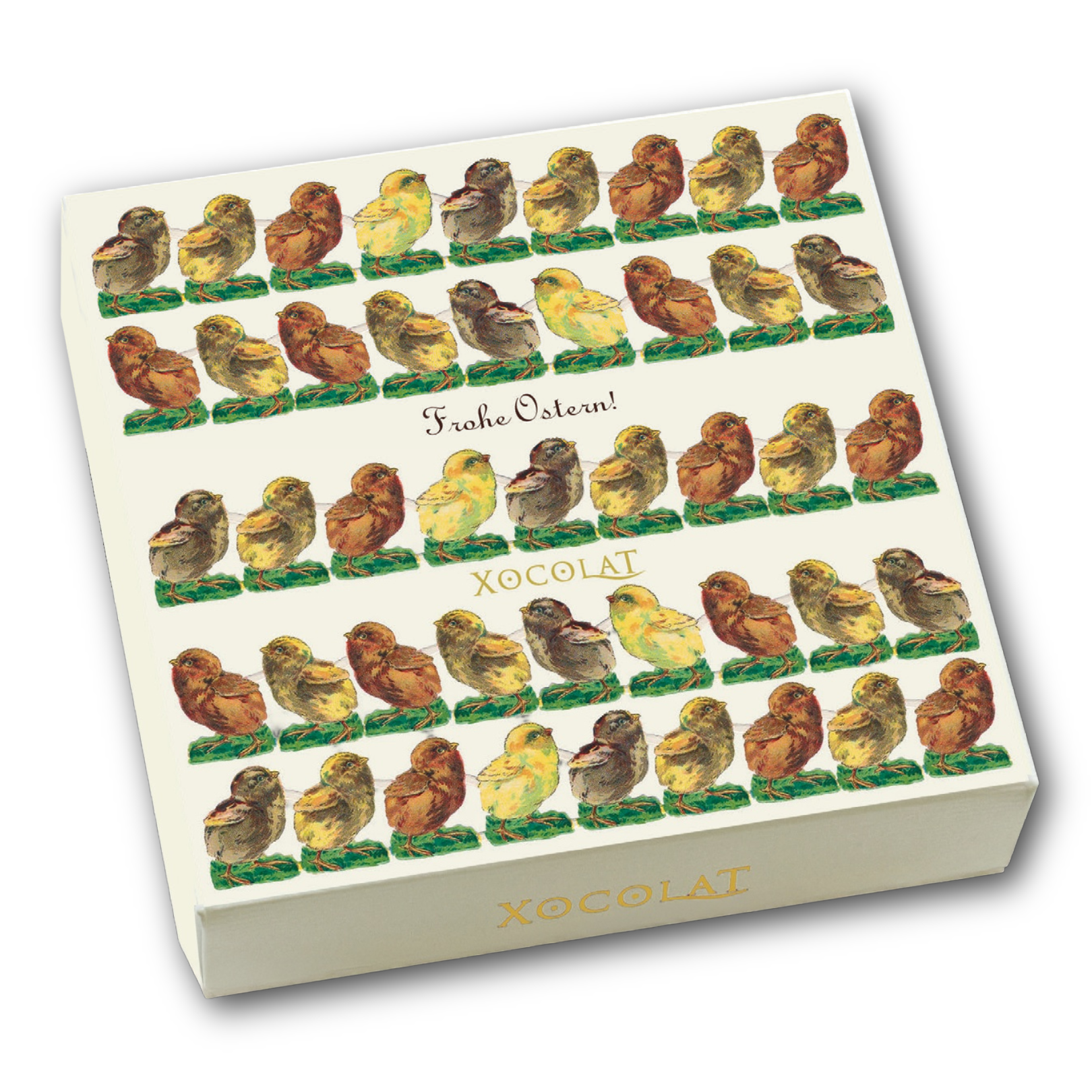 Nostalgischer Ostergenuss im viktorianischen Stil: Diese Osterbonbonniere birgt eine handverlesene Auswahl aus neun Stück Trüffeln und Konfekt aus dem Xocolat Sortiment.