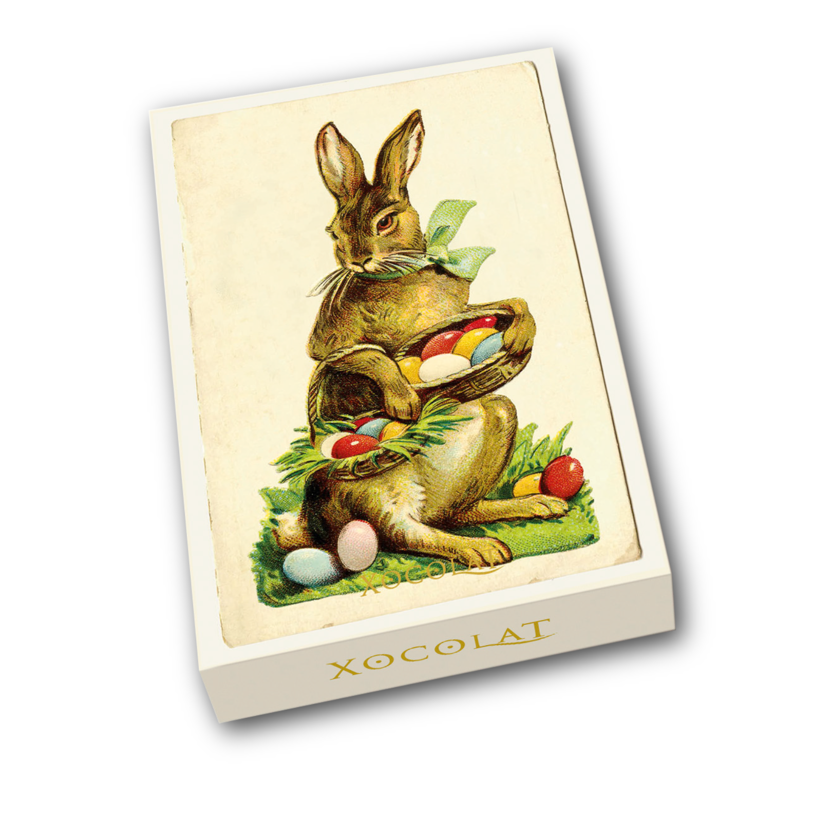 Oster-Bonbonniere mit viktorianischem Hasenmotiv, gefüllt mit vier optimal frischen Trüffeln und feinstem Konfekt aus dem Xocolat-Sortiment.