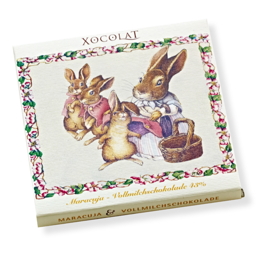 Die exotisch reizvolle Verbindung von Vollmilchschokolade und Maracujastückchen in einer österlichen Ausführung.