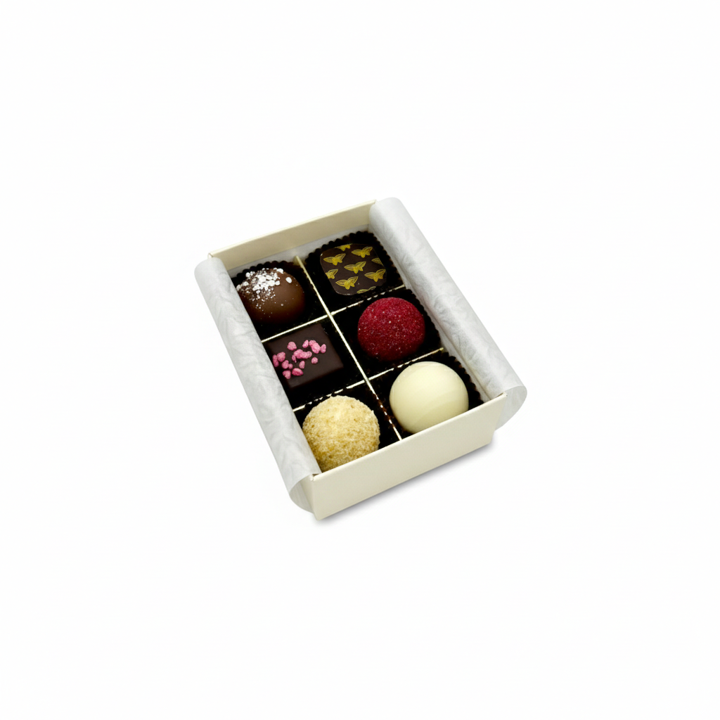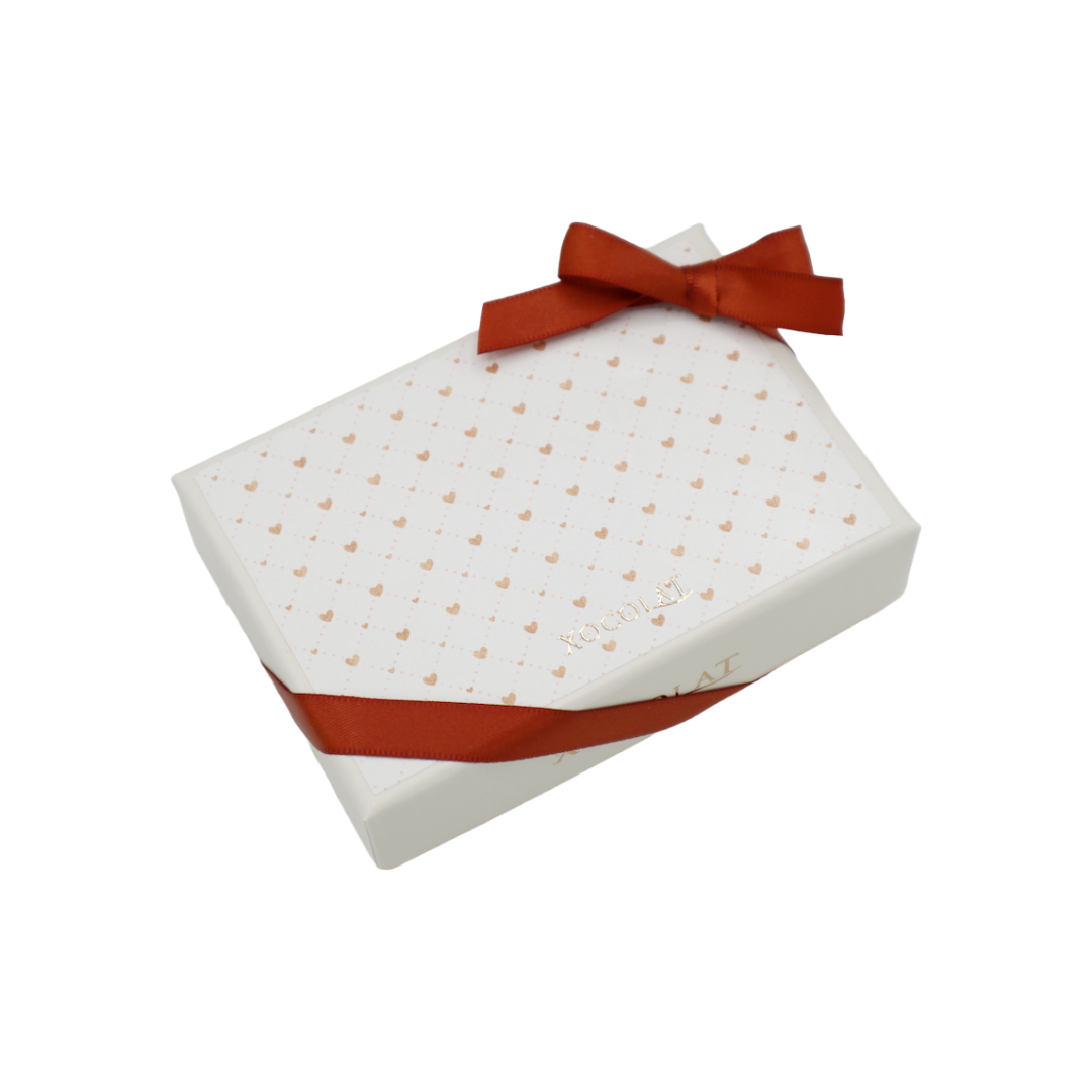 Bonbonniere mit klassischem Herzmuster, goldener Xocolat-Prägung und eleganter Satinmasche in Kupfer-Orange. Im Inneren befinden sich 6 Stück feinste Trüffel und Konfekt aus der Xocolat Manufaktur, Wien.