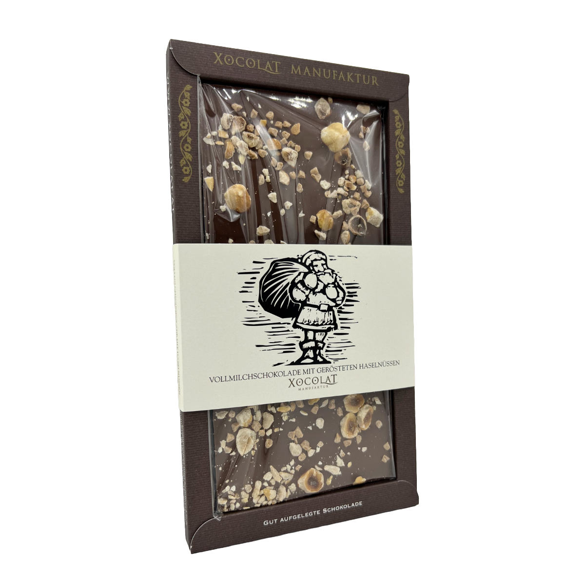Vollmilchschokolade mit 44 % Kakaogehalt („Blend Xocolat“ – eine Kombination aus Valrhona Couverture mit reinsortiger Criollo- Schokolade aus Venezuela), bestreut mit karamellisierten Haselnüssen aus Frankreich.