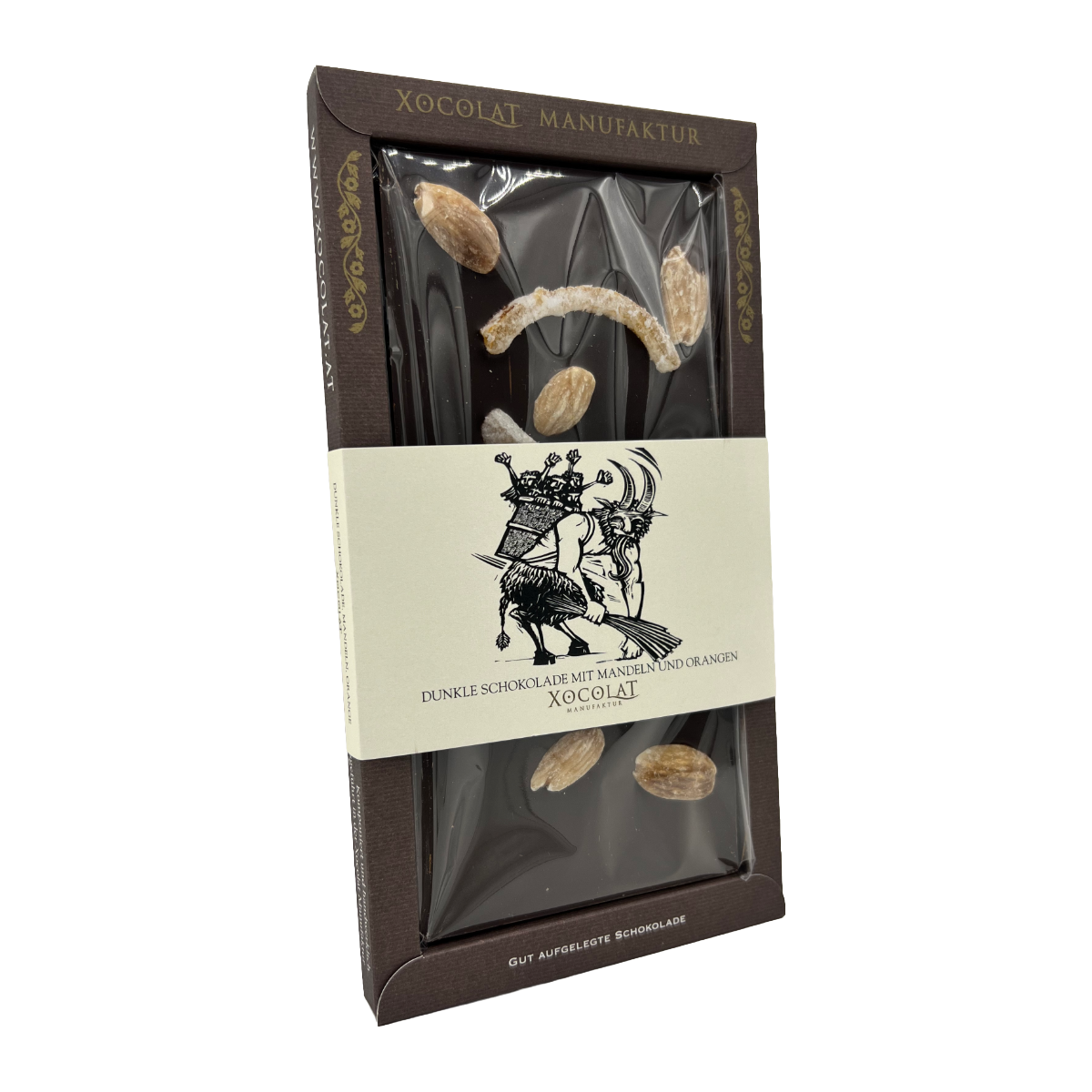 Mäßig herbe Schokolade mit mindestens 56 % Kakaogehalt und einer natürlichen Orangen- Aromatisierung. Belegt mit Mandeln und Streifen von kristallisierten Orangenschalen.
