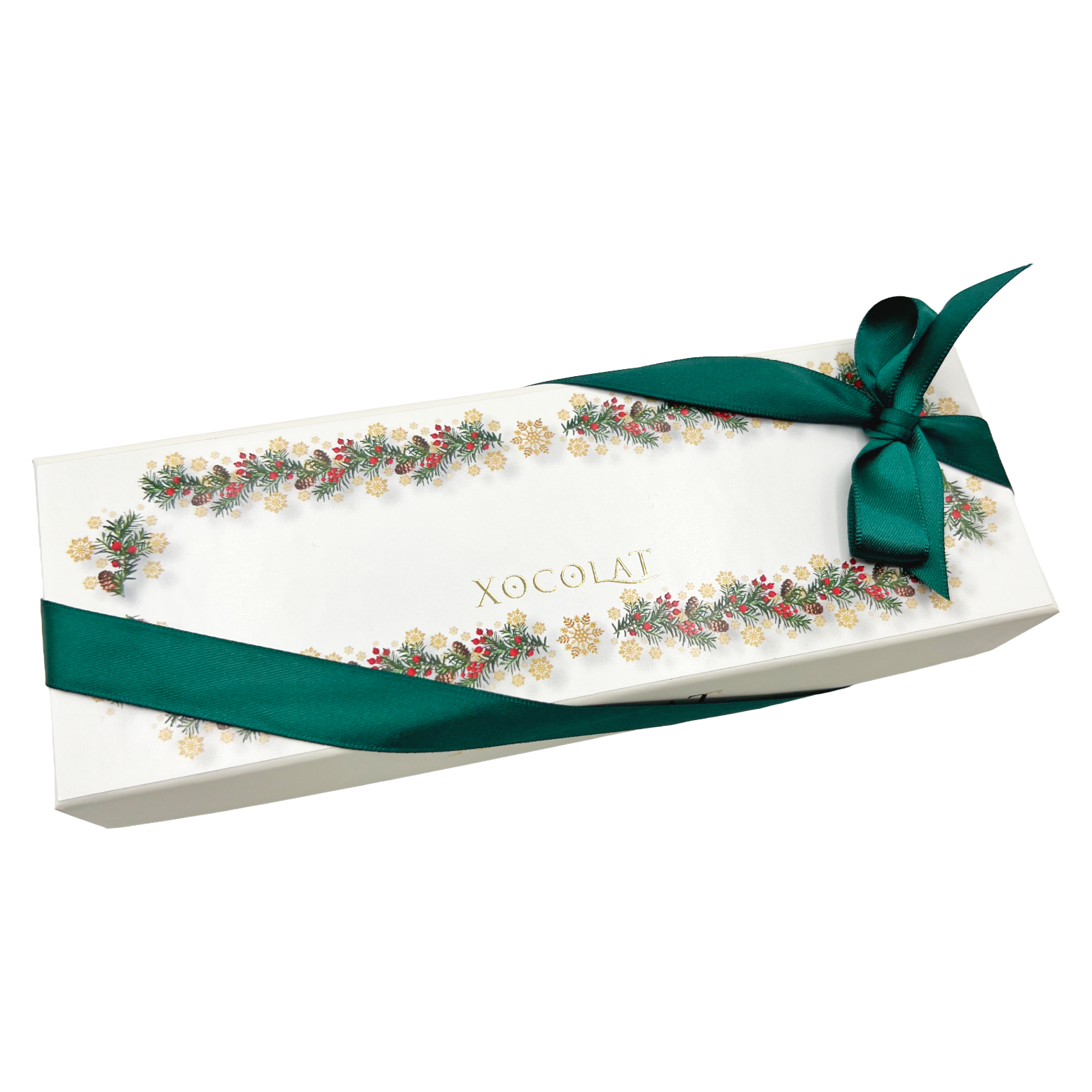 Festliche Bonbonniere mit weihnachtlichem Blätterkranz-Motiv, veredelt mit einem tannengrünen Satinband. Gefüllt mit 12 Stück feinstem Konfekt aus der Xocolat Manufaktur.
