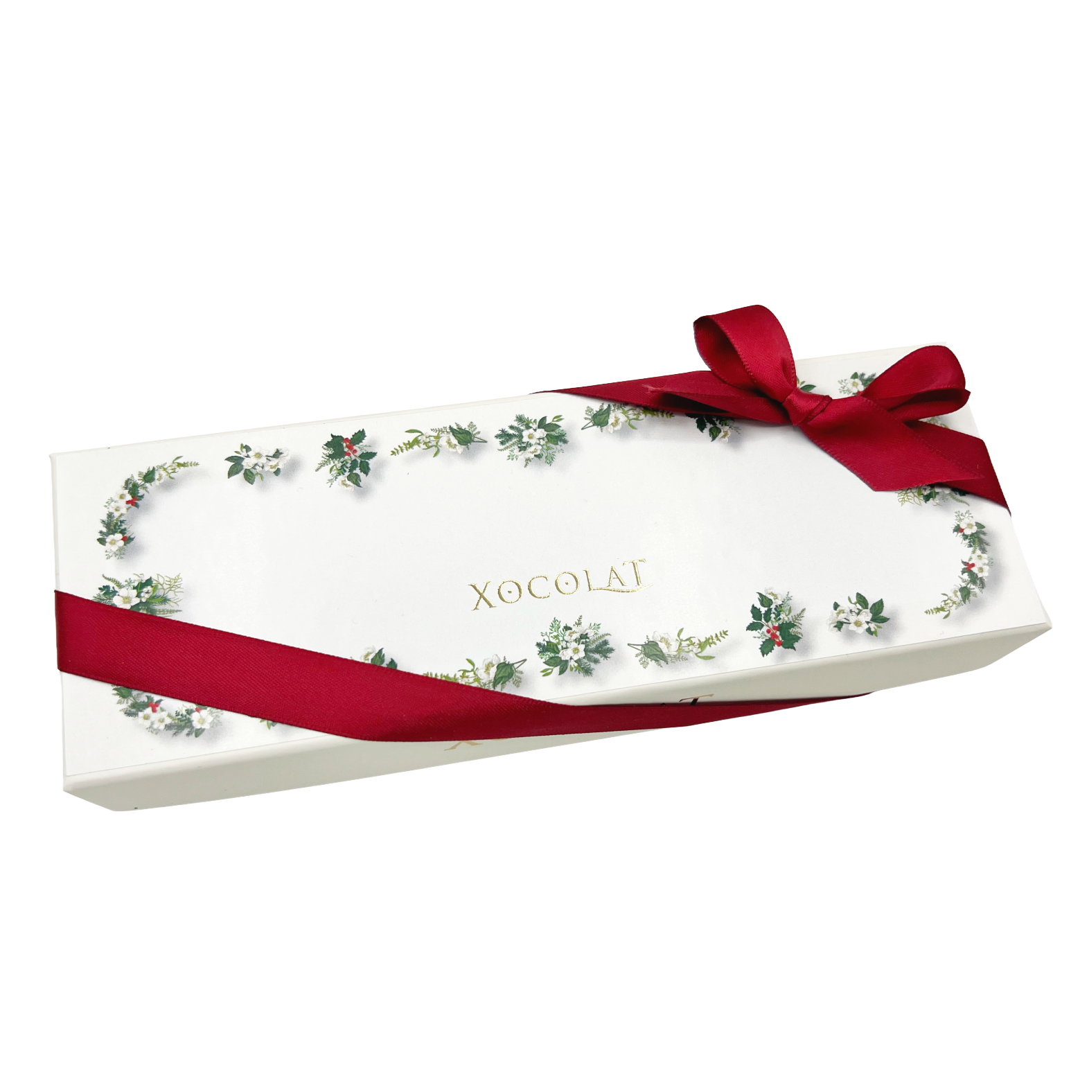 Festliche Bonbonniere mit weihnachtlichem Blätterkranz-Motiv, veredelt mit einem rotem Satinband. Gefüllt mit 12 Stück feinstem Konfekt aus der Xocolat Manufaktur.