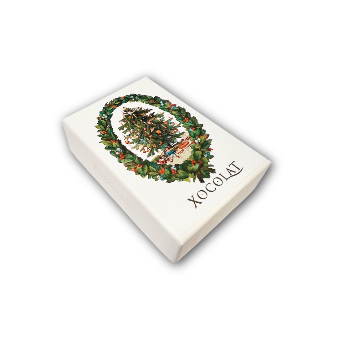Weihnachtsbonbonniere mit nostalgischem Motiv aus viktorianischer Zeit. Im Inneren befinden sich sechs Stück alkoholfreies Konfekt aus der Xocolat Manufaktur – handgefertigt mit Liebe zum Detail und ideal als stilvolles Geschenk oder feine Aufmerksamkeit in der Adventszeit.