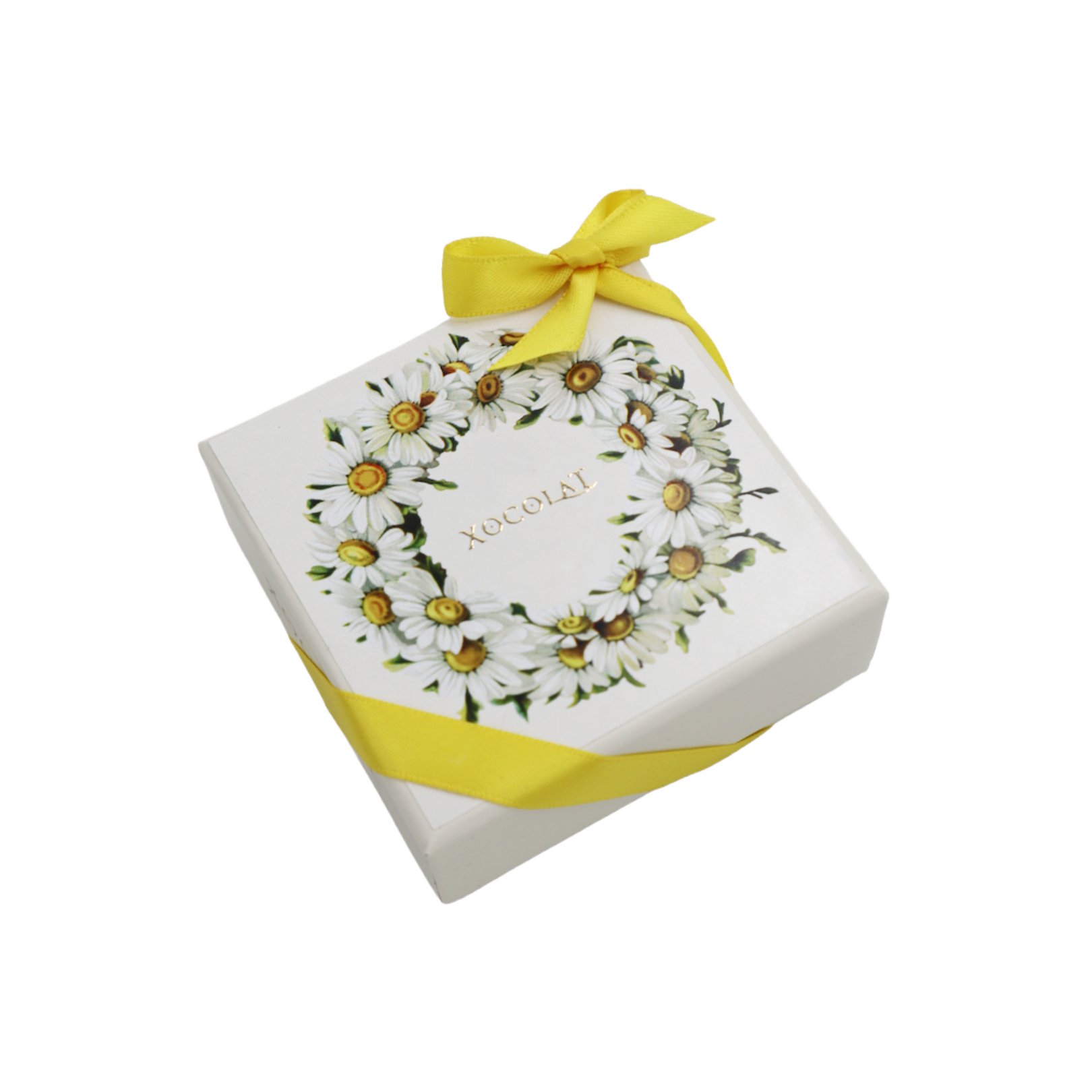 Bonbonniere mit klassischem Blumenmuster und goldener Xocolat-Prägung. Im Inneren befinden sich 4 Stück feinste Trüffel und Konfekt aus der Xocolat Manufaktur, Wien.